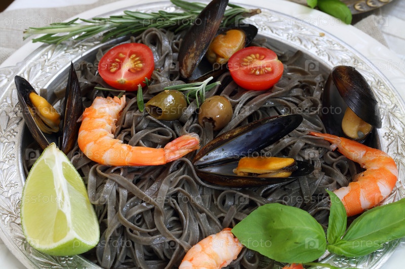 Черные спагетти с мидиями, креветками, чесноком, помидорами черри и лаймом