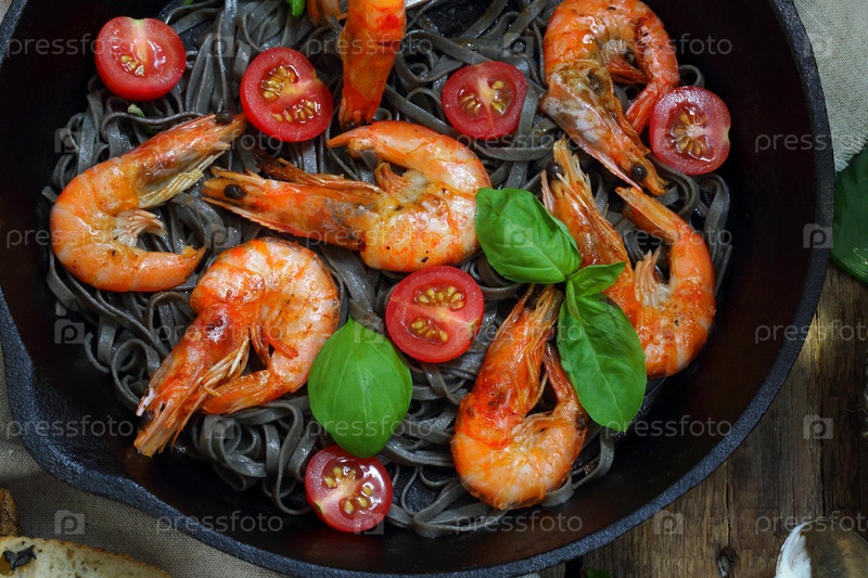 Черные спагетти с мидиями, креветками, чесноком, помидорами черри и лаймом