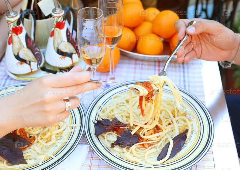 Женская рука и мужская с вилкой со спагетти