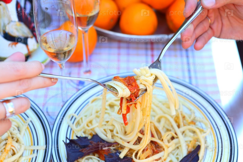 Женская рука с бокалом вина и мужская с вилкой со спагетти