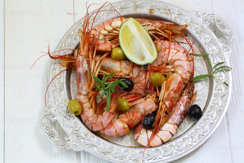 Лангустины с оливками,лаймом и розмарином на белом столе