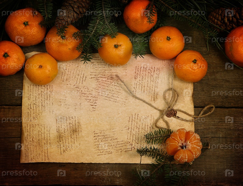 Елочные ветки с мандаринами на деревянном столе
