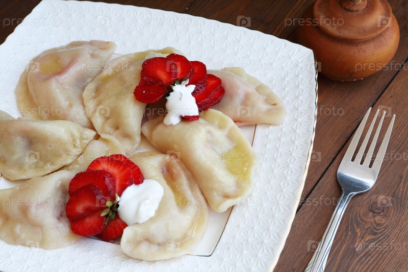Вареники с клубникой, сметаной, на белой тарелке на коричневом фоне