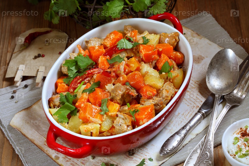 Тыква с мясом и овощами в керамической форме на деревянном столе