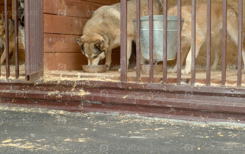 Собака в собачьем приюте ест. Концепция волонтерства и помощи