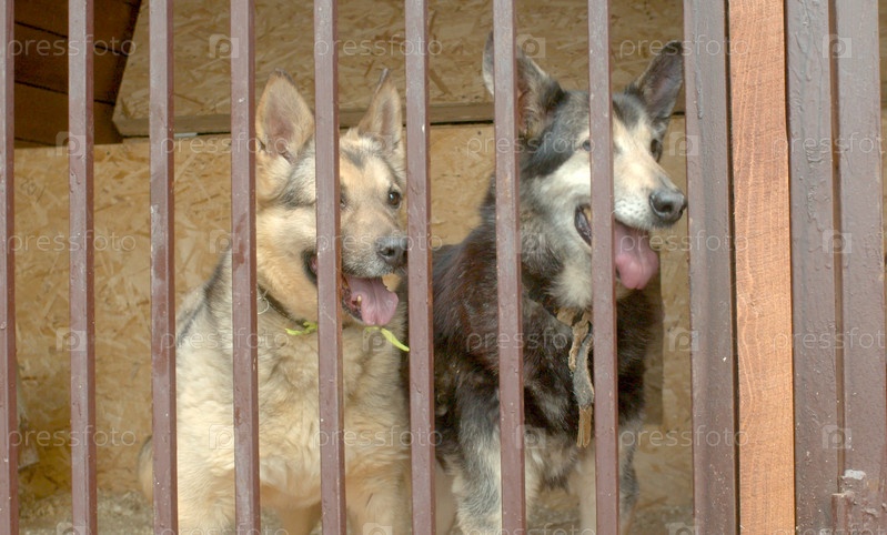 Две собаки в приюте для собак ждут добровольцев. Концепция волонтерства и помощи