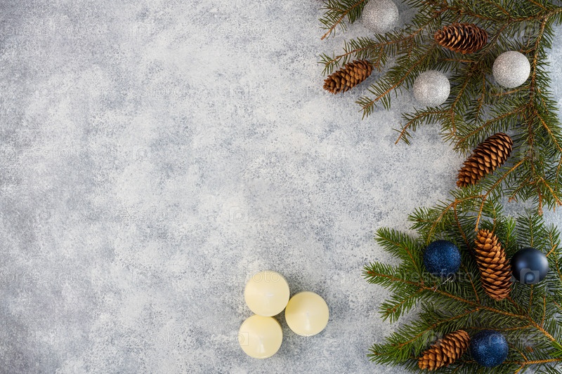 Елочные шары со свечами, с шишками на сером фоне. Выборочный фокус. Место для копирования. вид сверху. Рождество, новогодняя открытка. новогодний фон