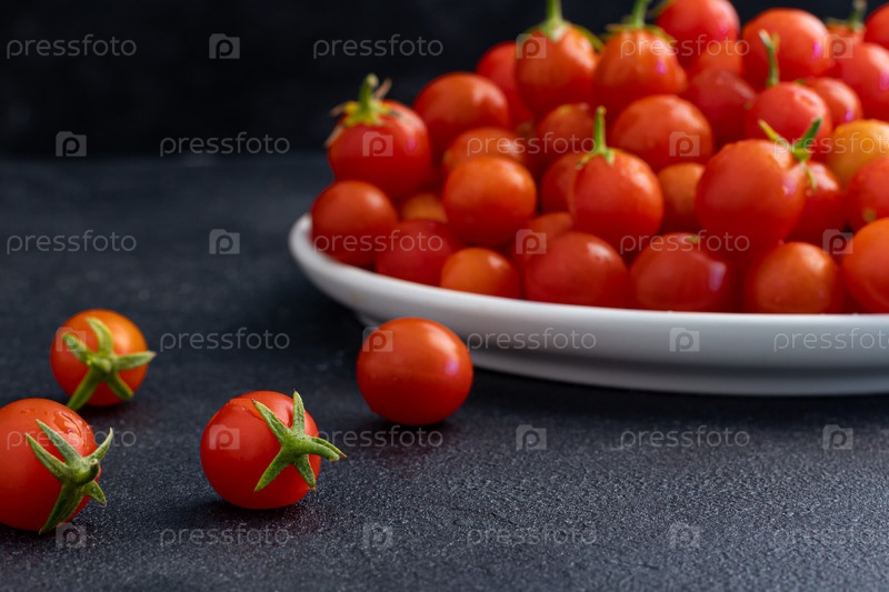 Красные помидоры черри в светлом блюде на темном фоне, вегетарианский продукт, здоровая пища