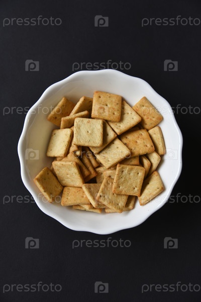 Вкусные острые печенья в белой тарелке на черном фоне