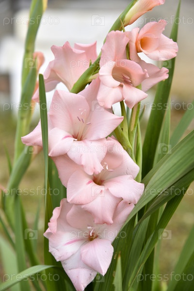 Нежные розовые листья цветов гладиолуса на кусте. Розовый цветок крупным планом