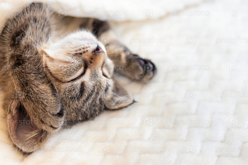 Симпатичный маленький серый полосатый котенок спит на кровати на теплом уютном бежевом одеяле. Концепция отдыха, релаксации, праздника