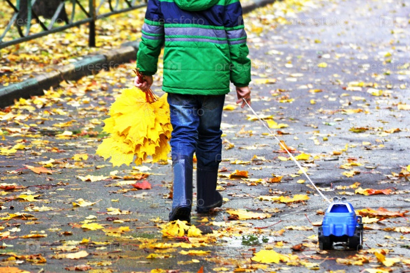Мальчик в зеленой куртке, сапогах идет по дороге, покрытой опавшими листьями, тянет игрушечную машинку и представляет собой букет из желтых листьев ручной работы