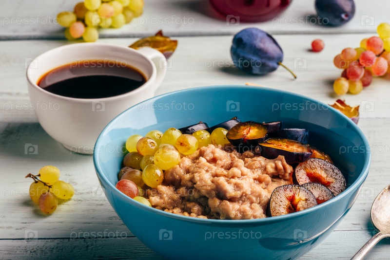 Каша со свежей сливой, зеленым виноградом и чашкой кофе
