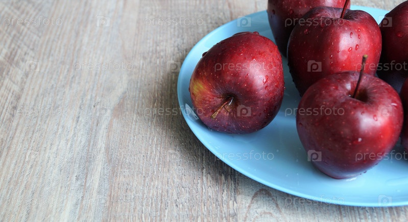 Красные яблоки на голубой тарелке