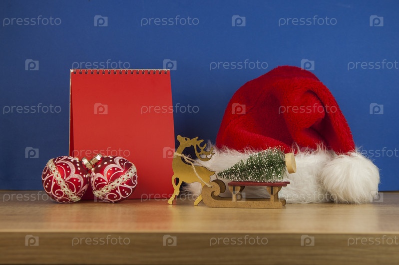 Пустой настольный календарь, шляпа Санты и рождественское украшение. Копировать пространство
