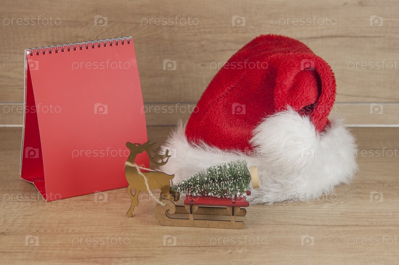 Пустой настольный календарь, шляпа Санты и рождественское украшение. Копировать пространство
