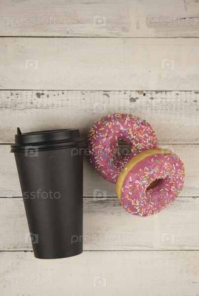 Красочные пончики и одноразовая чашка кофе на деревянном столе. Фото сладостей. Скопируйте пространство