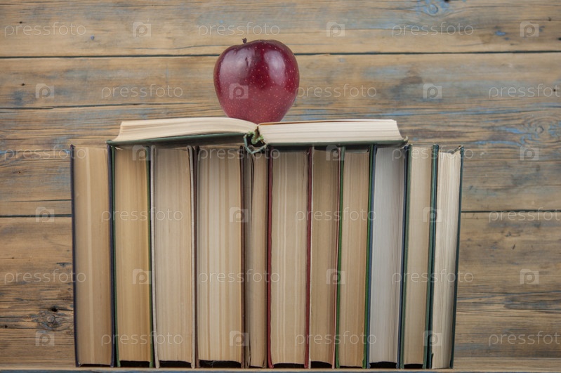 Стопка красочных книг, красное яблоко, шероховатый деревянный фон, свободное место для копирования