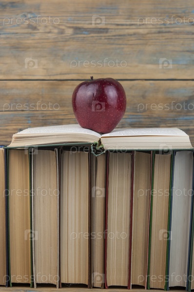 Стопка красочных книг, красное яблоко, шероховатый деревянный фон, свободное место для копирования