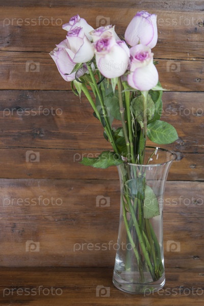 Букет розовых роз в стеклянной вазе на светлой деревянной доске, цветочный фон. Праздничная рамка, подарочная карта с местом для копирования, макет