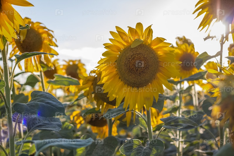Красивый подсолнух на естественном фоне в лучах заходящего солнца. Выборочный фокус