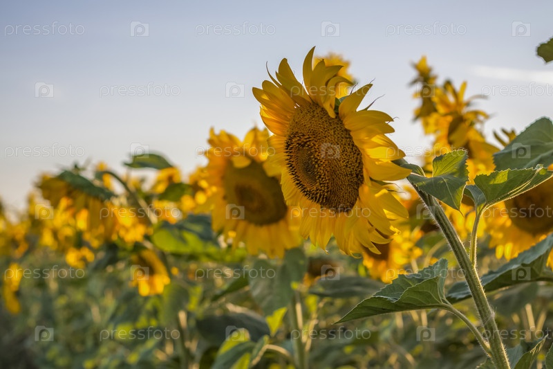 Красивый подсолнух на естественном фоне в лучах заходящего солнца. Выборочный фокус