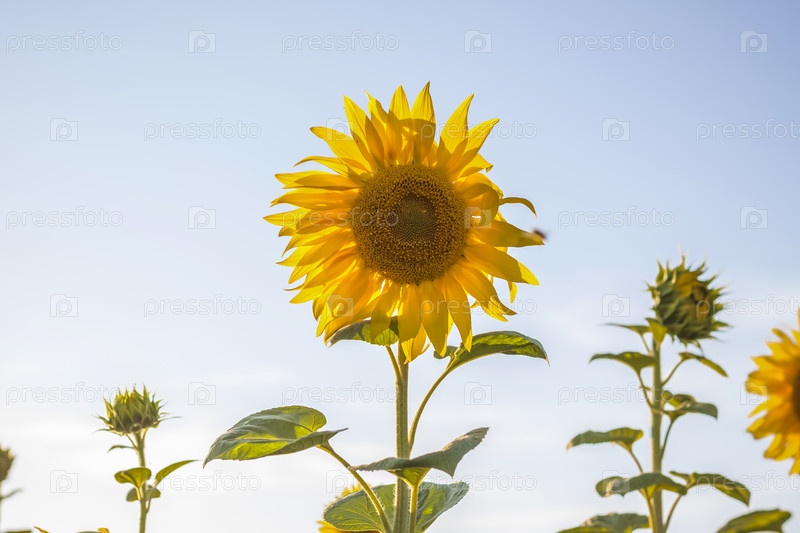 Красивый подсолнух на естественном фоне в лучах заходящего солнца. Выборочный фокус
