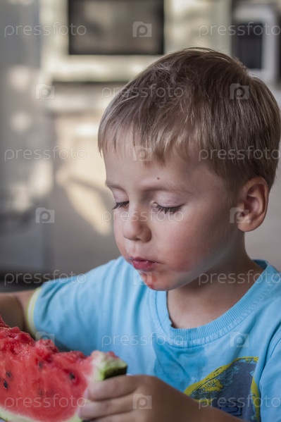 Милый мальчик ест арбуз дома. Настоящие эмоции без позирования