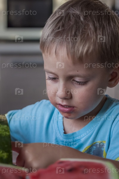 Милый мальчик ест арбуз дома. Настоящие эмоции без позирования