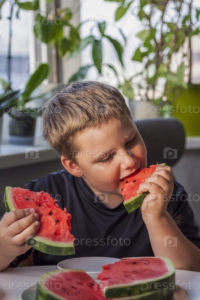 Милый мальчик ест арбуз дома. Настоящие эмоции без позирования
