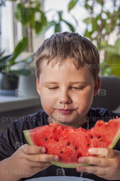 Милый мальчик ест арбуз дома. Настоящие эмоции без позирования