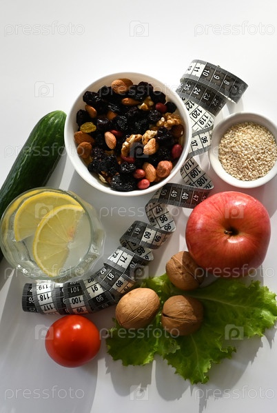 Вид сверху на свежие фрукты и овощи рядом с фонендоскопом на голубом деревянном фоне. Концепция здравоохранения. Сбалансированная диета. Копировать пространство