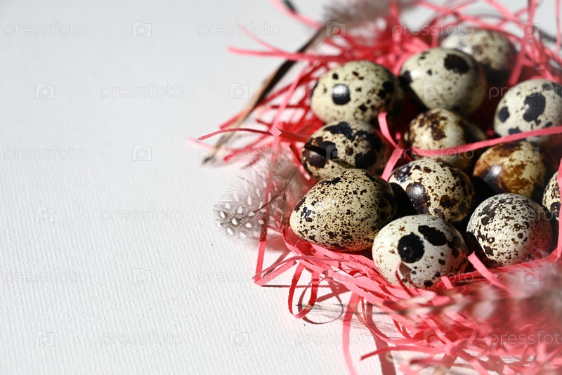 Куча перепелиных яиц, украшенных перьями. Органическая еда. Деревенский стиль. Вид сверху