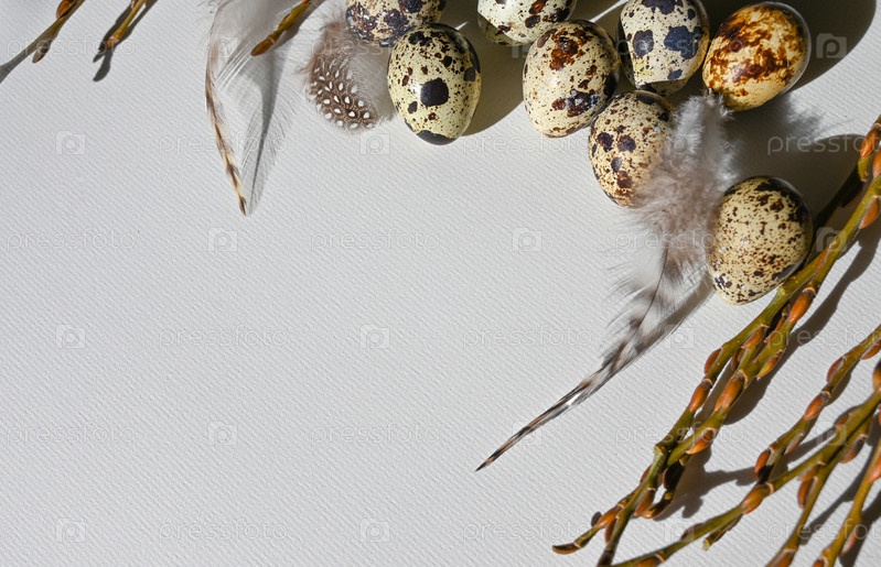 Куча перепелиных яиц, украшенных перьями. Органическая еда. Деревенский стиль. Вид сверху