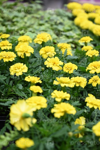Руки садовника держат горшок с календулой в цветочном магазине или теплице