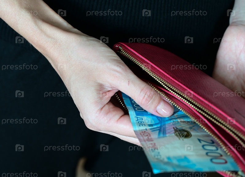 Девушка держит в руках кошелек. доллары, покупки, кошелек, полный долларов. оплатить счет