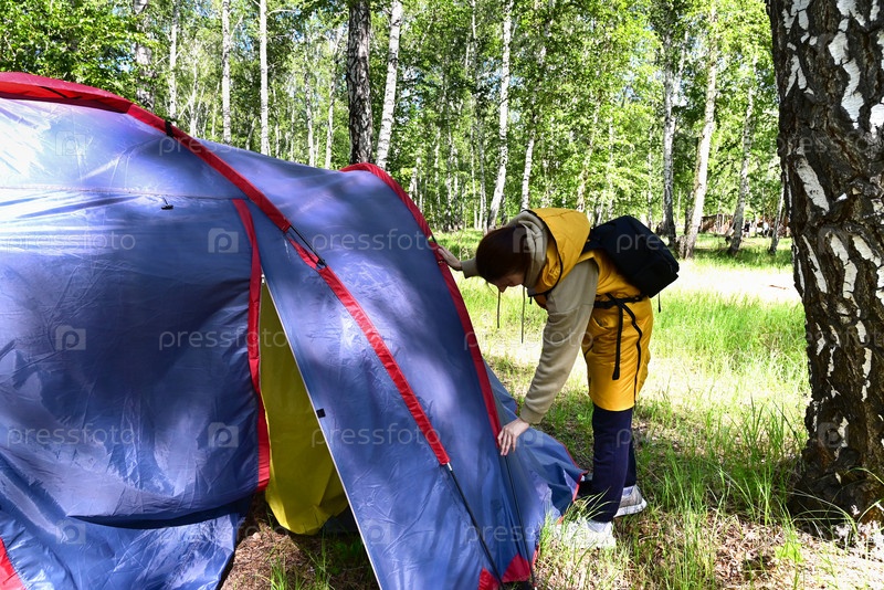Девушка устанавливает палатку для кемпинга во время своего пребывания на природе