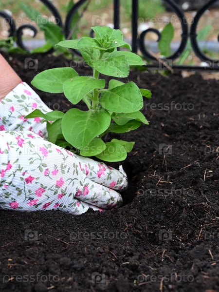 Рука кладет землю под петунию Концепция ухода за растениями и выращивания органических продуктов