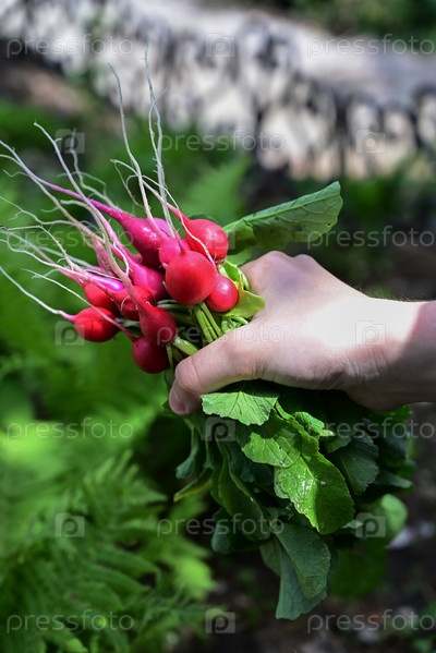 Свежий красный редис в белом дуршлаге. Фермерские органические овощи. Серый фон. Вид сверху