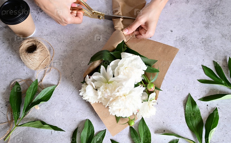 Женщина делает букет пионов, букет из крафт бумаги., обрезка цветов, столпник делает букет
