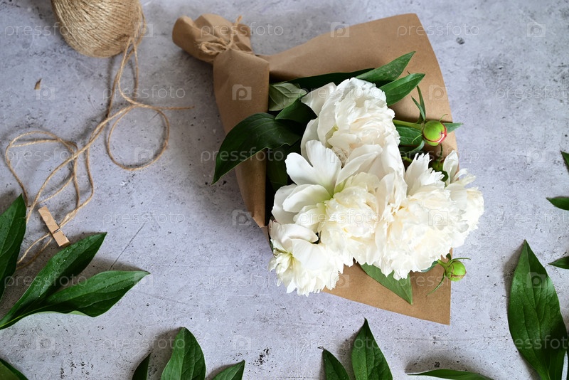 Женщина делает букет пионов, букет из крафт бумаги., обрезка цветов, столпник делает букет