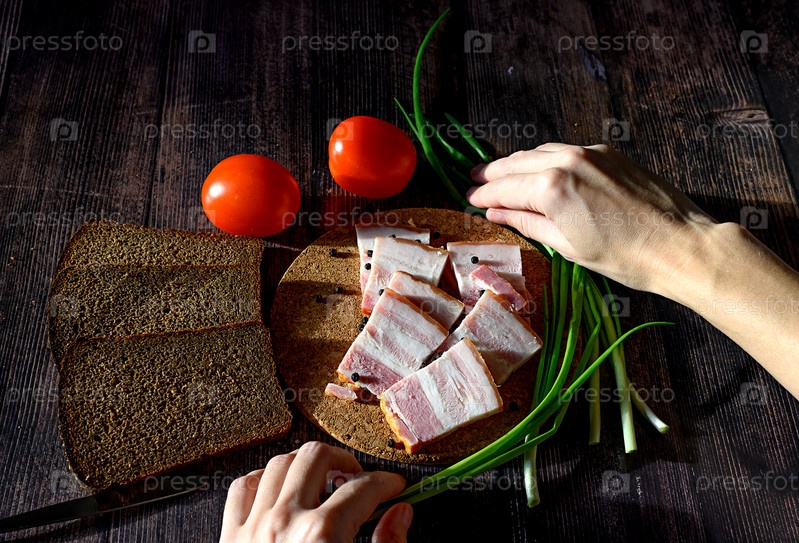Сало с черным хлебом и зеленым луком на темном фоне, русская национальная еда