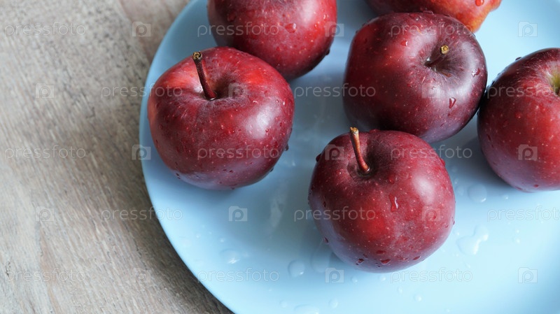 Красные яблоки на голубой тарелке