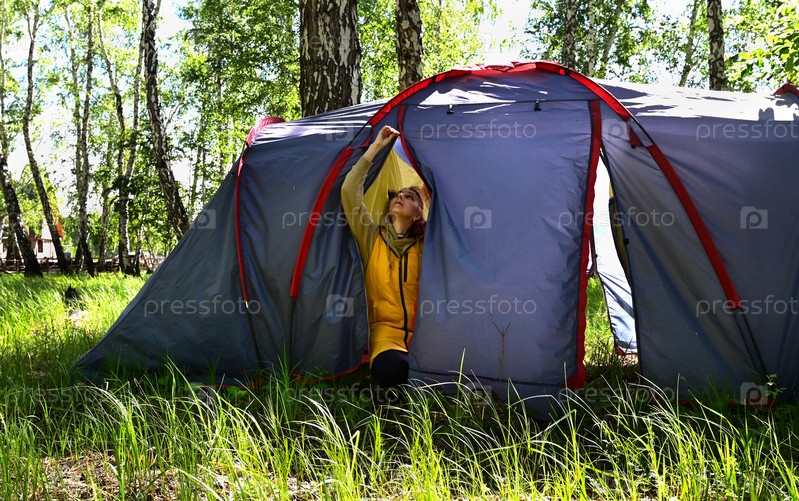 Девушка устанавливает палатку для кемпинга во время своего пребывания на природе