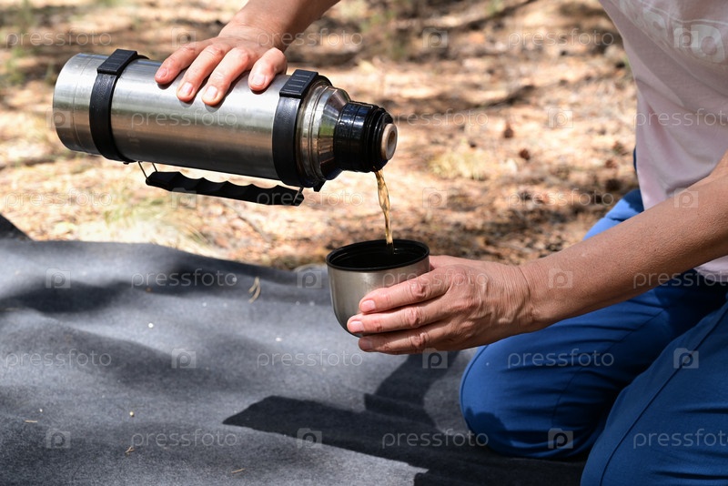 Женские руки наливают чай из термоса в лесу на пикнике