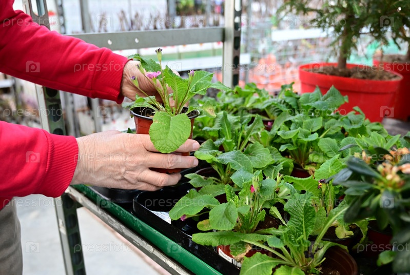 Руки садовника держат горшок с цветком в цветочном магазине или теплице
