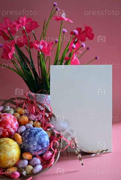 Красочные пасхальные яйца в гнезде на лугу