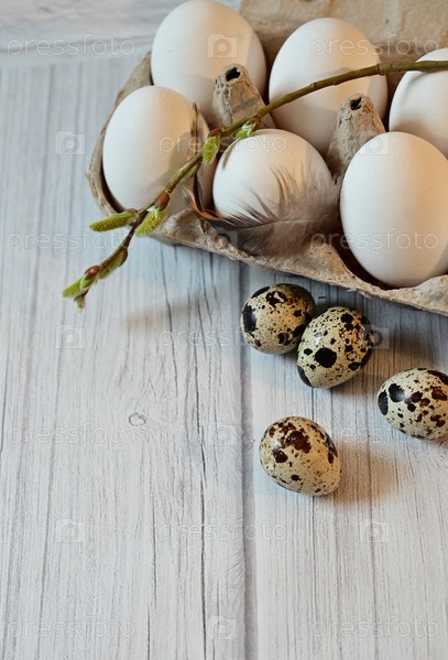 Куча перепелиных яиц, украшенных перьями. Органическая еда. Деревенский стиль. Вид сверху