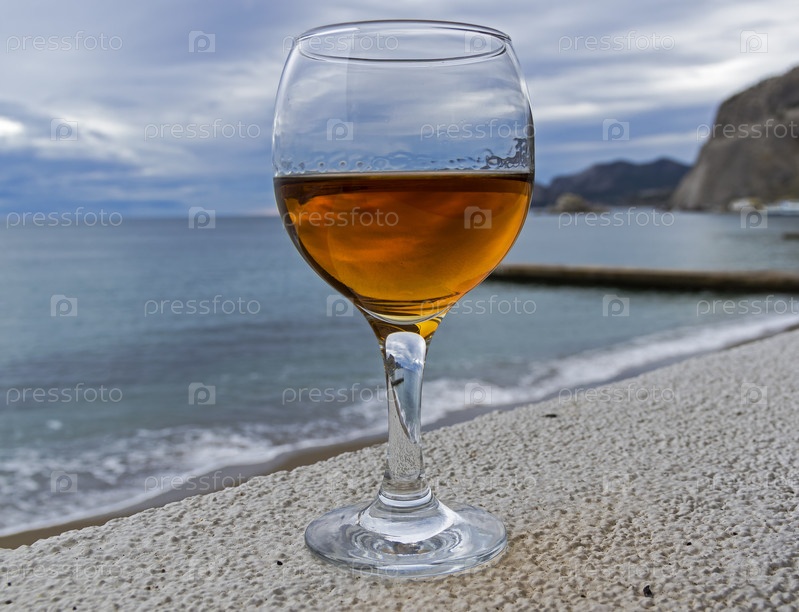 Бокал с вином на фоне моря. Крым, весна, начало апреля