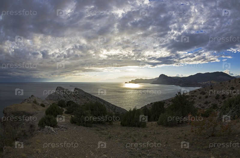 Вечернее солнце отражается в море. Вид с вершины мыса Алчак. Судак, Крым, сентябрь